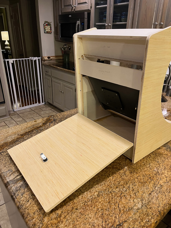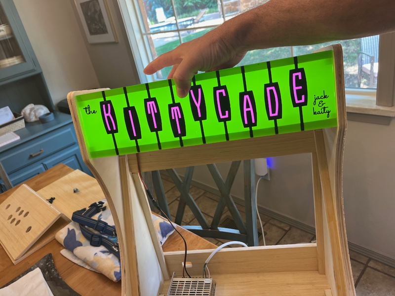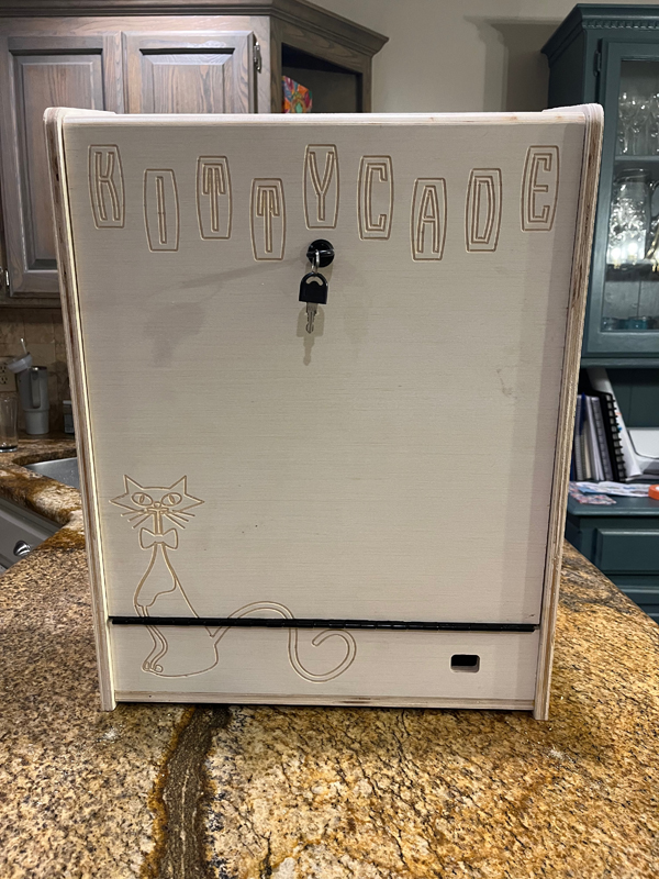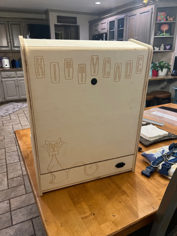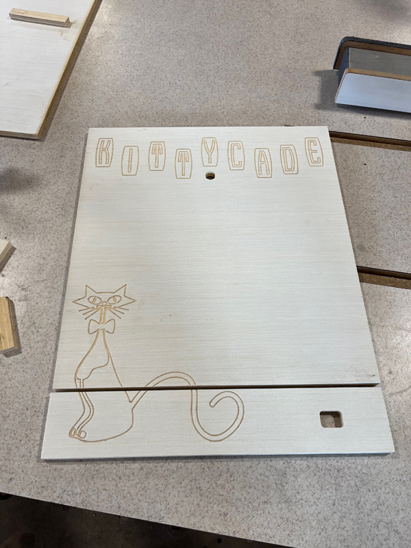 Really at the last minute we decided to add the detail of engraving the outline of the Kitty and the Marquee in the back panels. Since the Kittycade is a bartop arcade, the back will be visible while it sits on the bar. This will make the back look “finished”.