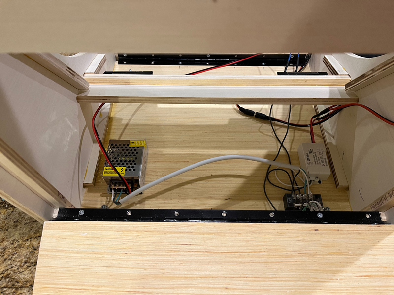 Then it was time to start wiring in the power supplies and powered items like the marquee light and the power switch, both of which need 12VDC, and the amplifier and volume control for the speakers which needs 5VDC: