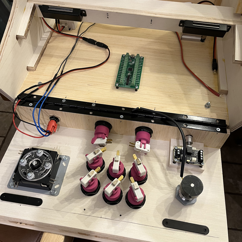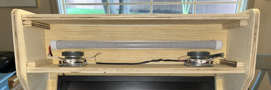 We used epoxy to mount standoffs for the I-PAC controller circuit board and the amplifier/volume control for the speakers. This will allow us to remove these to repair or replace if necessary: